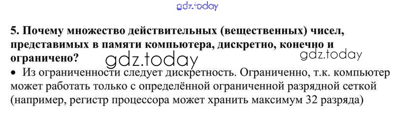 На страницах сайта gdz.today вы найдете учебный и вспомогательный материал, направленный на улучшения знаний школьной программы. ГДЗ - онлайн мир знаний Решение к §5. Представление чисел в компьютере 5 Учебнику по Информатике для 10 класса Семакин, Хеннер Базовый уровень Бином 2017