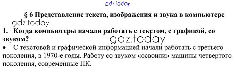 На страницах сайта gdz.today вы найдете учебный и вспомогательный материал, направленный на улучшения знаний школьной программы. ГДЗ - онлайн мир знаний Решение к §6. Представление текста, изображения и звука 1 Учебнику по Информатике для 10 класса Семакин, Хеннер Базовый уровень Бином 2017