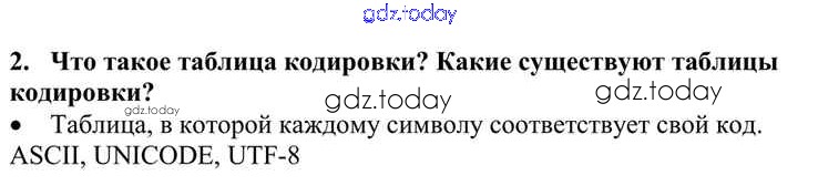 На страницах сайта gdz.today вы найдете учебный и вспомогательный материал, направленный на улучшения знаний школьной программы. ГДЗ - онлайн мир знаний Решение к §6. Представление текста, изображения и звука 2 Учебнику по Информатике для 10 класса Семакин, Хеннер Базовый уровень Бином 2017
