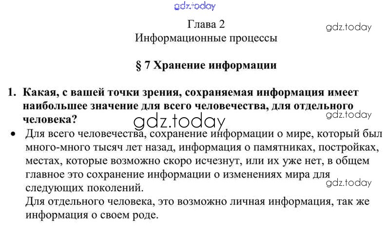 На страницах сайта gdz.today вы найдете учебный и вспомогательный материал, направленный на улучшения знаний школьной программы. ГДЗ - онлайн мир знаний Решение к §7. Хранение информации 1 Учебнику по Информатике для 10 класса Семакин, Хеннер Базовый уровень Бином 2017