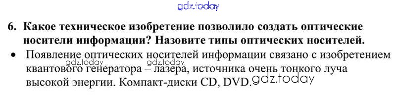 На страницах сайта gdz.today вы найдете учебный и вспомогательный материал, направленный на улучшения знаний школьной программы. ГДЗ - онлайн мир знаний Решение к §7. Хранение информации 6 Учебнику по Информатике для 10 класса Семакин, Хеннер Базовый уровень Бином 2017