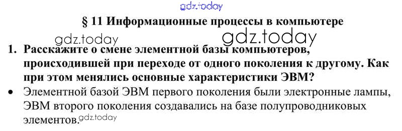 На страницах сайта gdz.today вы найдете учебный и вспомогательный материал, направленный на улучшения знаний школьной программы. ГДЗ - онлайн мир знаний Решение к §11. Информационные процессы в компьютере 1 Учебнику по Информатике для 10 класса Семакин, Хеннер Базовый уровень Бином 2017