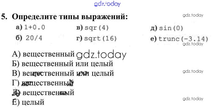 На страницах сайта gdz.today вы найдете учебный и вспомогательный материал, направленный на улучшения знаний школьной программы. ГДЗ - онлайн мир знаний Решение к §16. Операции, функции, выражения 5 Учебнику по Информатике для 10 класса Семакин, Хеннер Базовый уровень Бином 2017