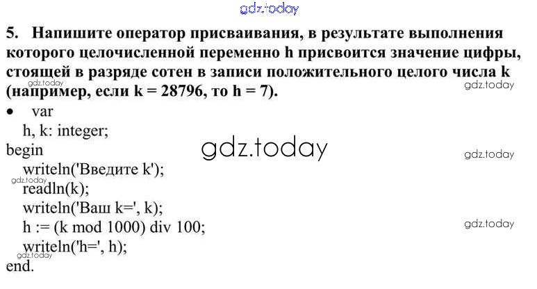 На страницах сайта gdz.today вы найдете учебный и вспомогательный материал, направленный на улучшения знаний школьной программы. ГДЗ - онлайн мир знаний Решение к §17. Оператор присваивания, ввод и вывод данных 5 Учебнику по Информатике для 10 класса Семакин, Хеннер Базовый уровень Бином 2017