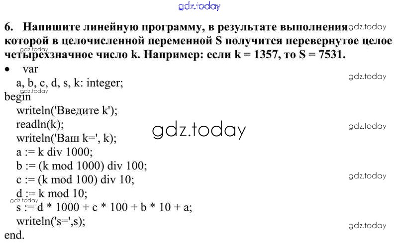На страницах сайта gdz.today вы найдете учебный и вспомогательный материал, направленный на улучшения знаний школьной программы. ГДЗ - онлайн мир знаний Решение к §17. Оператор присваивания, ввод и вывод данных 6 Учебнику по Информатике для 10 класса Семакин, Хеннер Базовый уровень Бином 2017