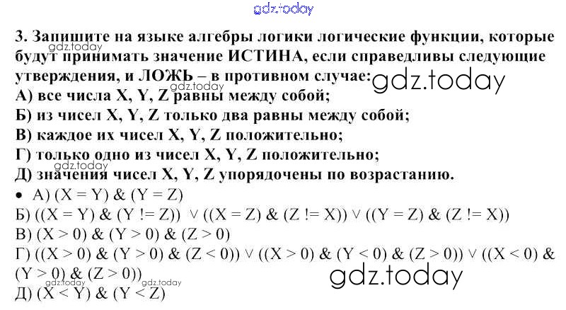 На страницах сайта gdz.today вы найдете учебный и вспомогательный материал, направленный на улучшения знаний школьной программы. ГДЗ - онлайн мир знаний Решение к §18. Логические величины, операции, выражения 3 Учебнику по Информатике для 10 класса Семакин, Хеннер Базовый уровень Бином 2017