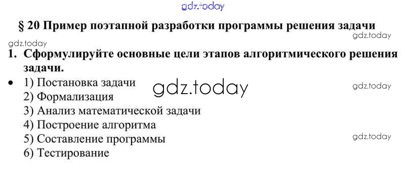 На страницах сайта gdz.today вы найдете учебный и вспомогательный материал, направленный на улучшения знаний школьной программы. ГДЗ - онлайн мир знаний Решение к §20. Пример поэтапной разработки программы решения задачи 1 Учебнику по Информатике для 10 класса Семакин, Хеннер Базовый уровень Бином 2017