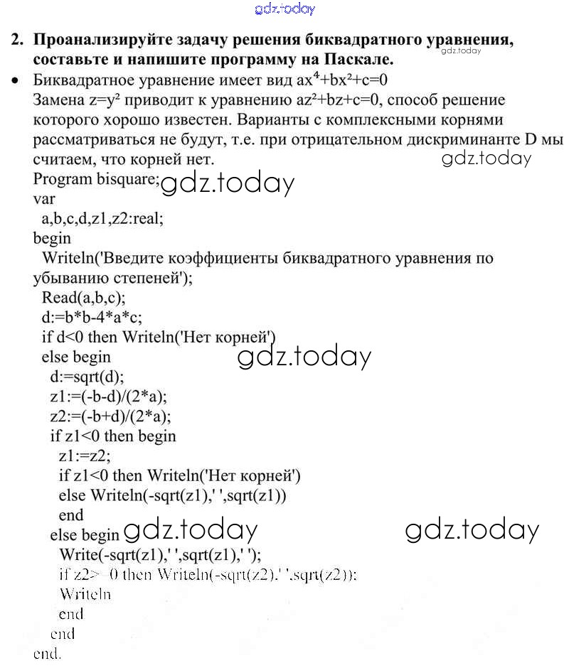 На страницах сайта gdz.today вы найдете учебный и вспомогательный материал, направленный на улучшения знаний школьной программы. ГДЗ - онлайн мир знаний Решение к §20. Пример поэтапной разработки программы решения задачи 2 Учебнику по Информатике для 10 класса Семакин, Хеннер Базовый уровень Бином 2017