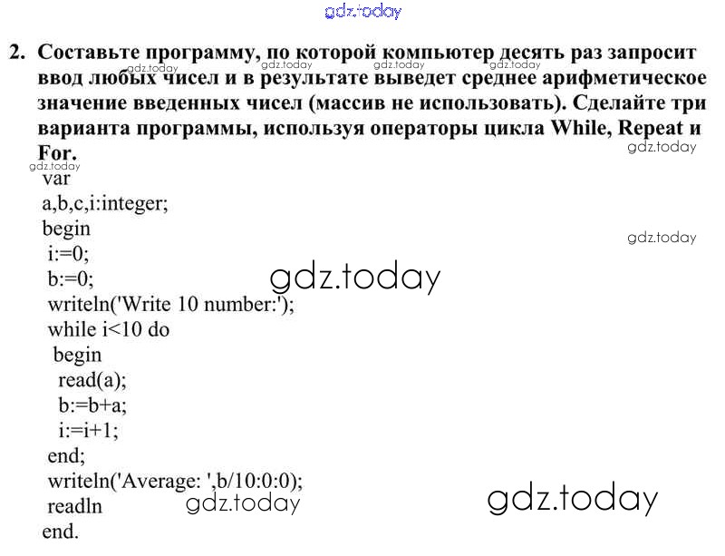 На страницах сайта gdz.today вы найдете учебный и вспомогательный материал, направленный на улучшения знаний школьной программы. ГДЗ - онлайн мир знаний Решение к §21. Программирование циклов 2 Учебнику по Информатике для 10 класса Семакин, Хеннер Базовый уровень Бином 2017