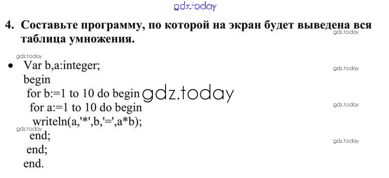 На страницах сайта gdz.today вы найдете учебный и вспомогательный материал, направленный на улучшения знаний школьной программы. ГДЗ - онлайн мир знаний Решение к §21. Программирование циклов 4 Учебнику по Информатике для 10 класса Семакин, Хеннер Базовый уровень Бином 2017