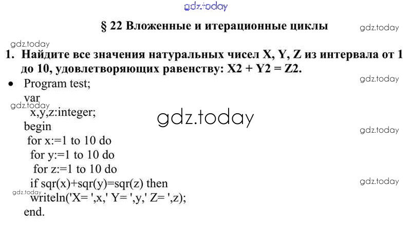На страницах сайта gdz.today вы найдете учебный и вспомогательный материал, направленный на улучшения знаний школьной программы. ГДЗ - онлайн мир знаний Решение к §22. Вложенные и итерационные циклы 1 Учебнику по Информатике для 10 класса Семакин, Хеннер Базовый уровень Бином 2017