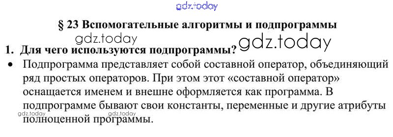 На страницах сайта gdz.today вы найдете учебный и вспомогательный материал, направленный на улучшения знаний школьной программы. ГДЗ - онлайн мир знаний Решение к §23. Вспомогательные алгоритмы и подпрограммы 1 Учебнику по Информатике для 10 класса Семакин, Хеннер Базовый уровень Бином 2017