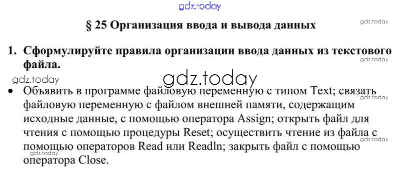 На страницах сайта gdz.today вы найдете учебный и вспомогательный материал, направленный на улучшения знаний школьной программы. ГДЗ - онлайн мир знаний Решение к §25. Организация ввода и вывода данных с использованием файлов 1 Учебнику по Информатике для 10 класса Семакин, Хеннер Базовый уровень Бином 2017