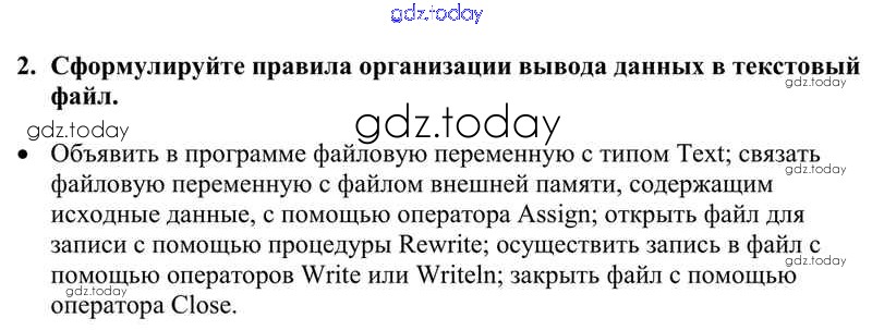 На страницах сайта gdz.today вы найдете учебный и вспомогательный материал, направленный на улучшения знаний школьной программы. ГДЗ - онлайн мир знаний Решение к §25. Организация ввода и вывода данных с использованием файлов 2 Учебнику по Информатике для 10 класса Семакин, Хеннер Базовый уровень Бином 2017