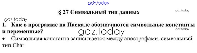 На страницах сайта gdz.today вы найдете учебный и вспомогательный материал, направленный на улучшения знаний школьной программы. ГДЗ - онлайн мир знаний Решение к §27. Символьный тип данных 1 Учебнику по Информатике для 10 класса Семакин, Хеннер Базовый уровень Бином 2017