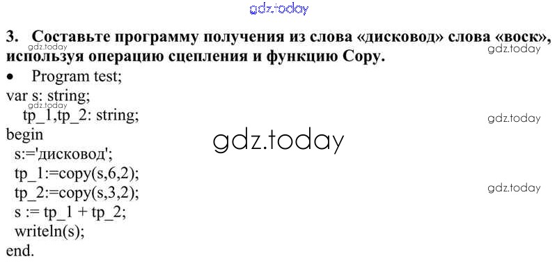 На страницах сайта gdz.today вы найдете учебный и вспомогательный материал, направленный на улучшения знаний школьной программы. ГДЗ - онлайн мир знаний Решение к §28. Строки символов 3 Учебнику по Информатике для 10 класса Семакин, Хеннер Базовый уровень Бином 2017