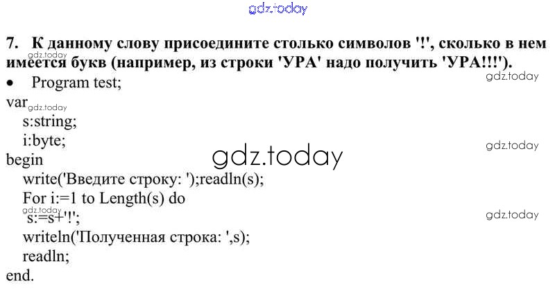 На страницах сайта gdz.today вы найдете учебный и вспомогательный материал, направленный на улучшения знаний школьной программы. ГДЗ - онлайн мир знаний Решение к §28. Строки символов 7 Учебнику по Информатике для 10 класса Семакин, Хеннер Базовый уровень Бином 2017