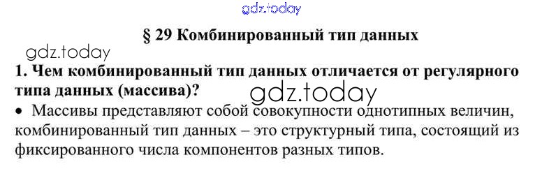 На страницах сайта gdz.today вы найдете учебный и вспомогательный материал, направленный на улучшения знаний школьной программы. ГДЗ - онлайн мир знаний Решение к §29. Комбинированный тип данных 1 Учебнику по Информатике для 10 класса Семакин, Хеннер Базовый уровень Бином 2017