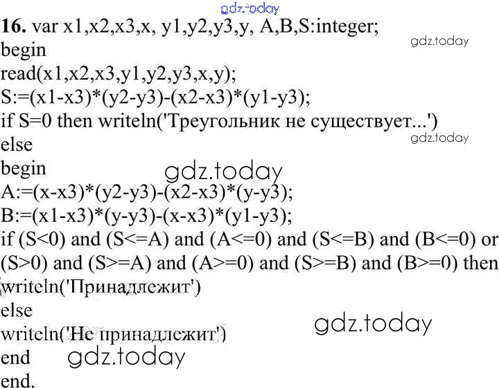 На страницах сайта gdz.today вы найдете учебный и вспомогательный материал, направленный на улучшения знаний школьной программы. ГДЗ - онлайн мир знаний Задание 1 Работа 3.3. Программирование ветвящихся алгоритмов 16 Учебнику по Информатике для 10 класса Семакин, Хеннер Базовый уровень Бином 2017