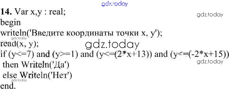 На страницах сайта gdz.today вы найдете учебный и вспомогательный материал, направленный на улучшения знаний школьной программы. ГДЗ - онлайн мир знаний Задание 2 Работа 3.3. Программирование ветвящихся алгоритмов 14 Учебнику по Информатике для 10 класса Семакин, Хеннер Базовый уровень Бином 2017