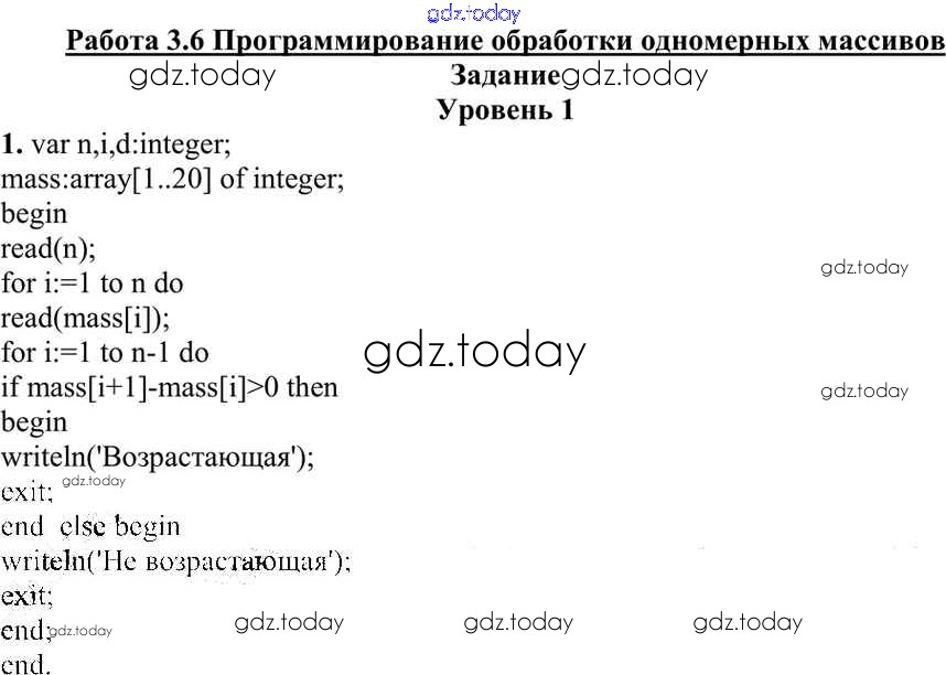 На страницах сайта gdz.today вы найдете учебный и вспомогательный материал, направленный на улучшения знаний школьной программы. ГДЗ - онлайн мир знаний Работа 3.6. Программирование обработки одномерных массивов Практические работы к главе 3 «Программирование обработки информации» 1 Учебнику по Информатике для 10 класса Семакин, Хеннер Базовый уровень Бином 2017