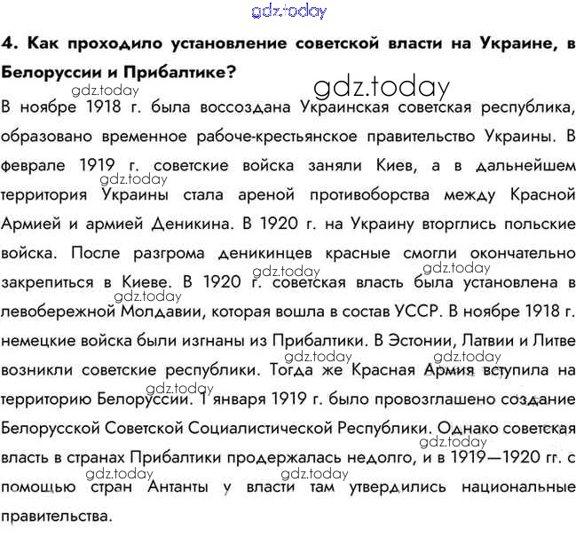На страницах сайта gdz.today вы найдете учебный и вспомогательный материал, направленный на улучшения знаний школьной программы. ГДЗ - онлайн мир знаний Вопросы и задания для работы с текстом параграфа Революция и Гражданская война на национальных окраинах. 4 Учебнику по Истории для 10 класса Горинов, Данилов Просвещение 2016