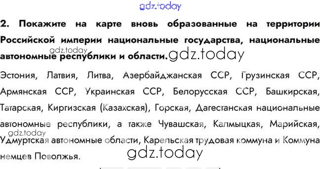 На страницах сайта gdz.today вы найдете учебный и вспомогательный материал, направленный на улучшения знаний школьной программы. ГДЗ - онлайн мир знаний Работаем с картой Революция и Гражданская война на национальных окраинах. 2 Учебнику по Истории для 10 класса Горинов, Данилов Просвещение 2016