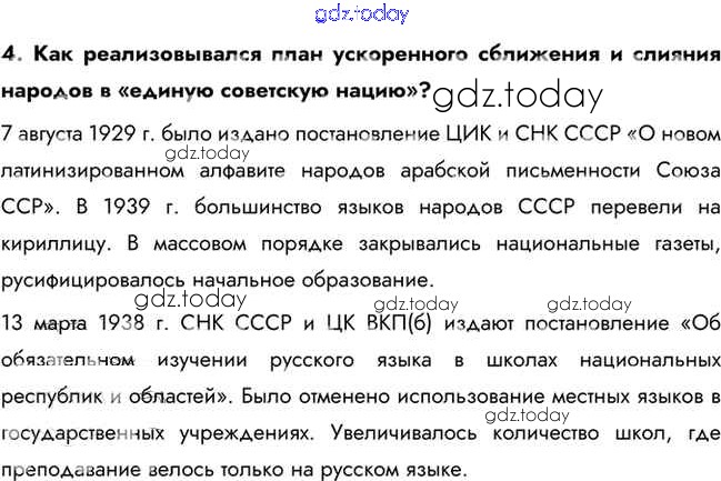 На страницах сайта gdz.today вы найдете учебный и вспомогательный материал, направленный на улучшения знаний школьной программы. ГДЗ - онлайн мир знаний Вопросы и задания для работы с текстом параграфа Советская национальная политика в 1930-е гг. 4 Учебнику по Истории для 10 класса Горинов, Данилов Просвещение 2016