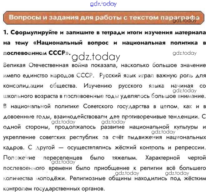 На страницах сайта gdz.today вы найдете учебный и вспомогательный материал, направленный на улучшения знаний школьной программы. ГДЗ - онлайн мир знаний Вопросы и задания для работы с текстом параграфа Национальный вопрос и национальная политика в послевоенном СССР 1 Учебнику по Истории для 10 класса Горинов, Данилов Просвещение 2016