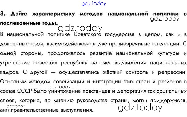 На страницах сайта gdz.today вы найдете учебный и вспомогательный материал, направленный на улучшения знаний школьной программы. ГДЗ - онлайн мир знаний Вопросы и задания для работы с текстом параграфа Национальный вопрос и национальная политика в послевоенном СССР 3 Учебнику по Истории для 10 класса Горинов, Данилов Просвещение 2016