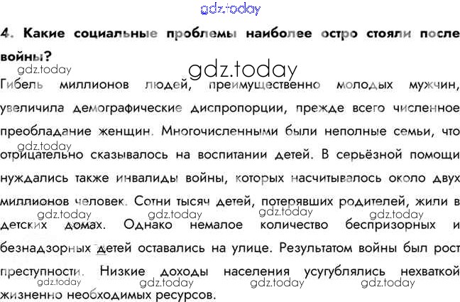 На страницах сайта gdz.today вы найдете учебный и вспомогательный материал, направленный на улучшения знаний школьной программы. ГДЗ - онлайн мир знаний Вопросы и задания для работы с текстом параграфа Послевоенная повседневность 4 Учебнику по Истории для 10 класса Горинов, Данилов Просвещение 2016