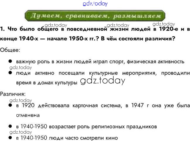 На страницах сайта gdz.today вы найдете учебный и вспомогательный материал, направленный на улучшения знаний школьной программы. ГДЗ - онлайн мир знаний Думаем, сравниваем, размышляем Послевоенная повседневность 1 Учебнику по Истории для 10 класса Горинов, Данилов Просвещение 2016