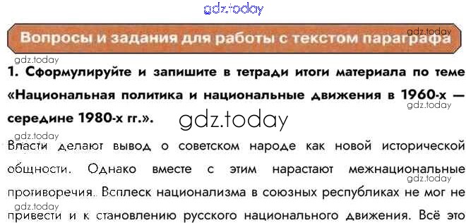 На страницах сайта gdz.today вы найдете учебный и вспомогательный материал, направленный на улучшения знаний школьной программы. ГДЗ - онлайн мир знаний Вопросы и задания для работы с текстом параграфа Национальная политика и национальные движения в 1960-х — середине 1980-х гг. 1 Учебнику по Истории для 10 класса Горинов, Данилов Просвещение 2016