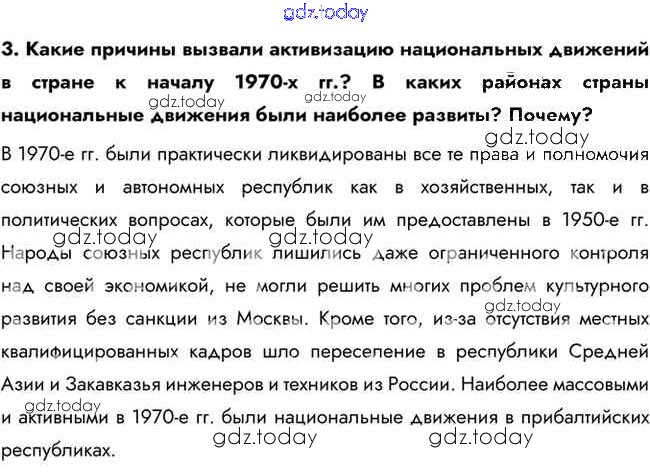 На страницах сайта gdz.today вы найдете учебный и вспомогательный материал, направленный на улучшения знаний школьной программы. ГДЗ - онлайн мир знаний Вопросы и задания для работы с текстом параграфа Национальная политика и национальные движения в 1960-х — середине 1980-х гг. 3 Учебнику по Истории для 10 класса Горинов, Данилов Просвещение 2016