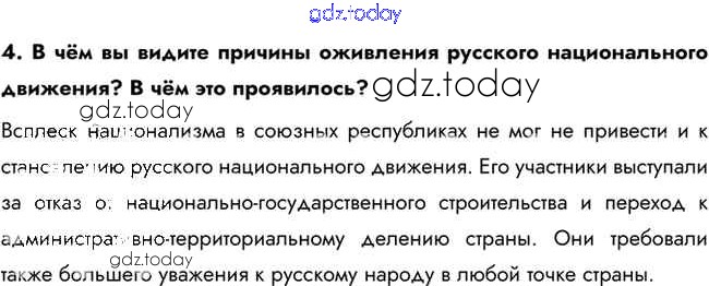 На страницах сайта gdz.today вы найдете учебный и вспомогательный материал, направленный на улучшения знаний школьной программы. ГДЗ - онлайн мир знаний Вопросы и задания для работы с текстом параграфа Национальная политика и национальные движения в 1960-х — середине 1980-х гг. 4 Учебнику по Истории для 10 класса Горинов, Данилов Просвещение 2016