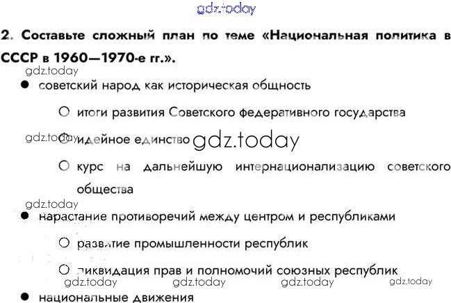 На страницах сайта gdz.today вы найдете учебный и вспомогательный материал, направленный на улучшения знаний школьной программы. ГДЗ - онлайн мир знаний Думаем, сравниваем, размышляем Национальная политика и национальные движения в 1960-х — середине 1980-х гг. 2 Учебнику по Истории для 10 класса Горинов, Данилов Просвещение 2016