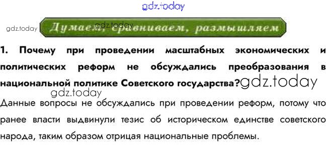 На страницах сайта gdz.today вы найдете учебный и вспомогательный материал, направленный на улучшения знаний школьной программы. ГДЗ - онлайн мир знаний Думаем, сравниваем, размышляем Решение к §44 1 Учебнику по Истории для 10 класса Горинов, Данилов Просвещение 2016