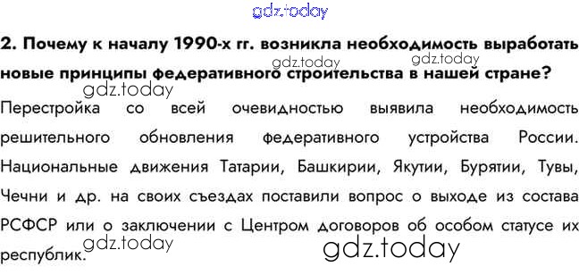 На страницах сайта gdz.today вы найдете учебный и вспомогательный материал, направленный на улучшения знаний школьной программы. ГДЗ - онлайн мир знаний Вопросы и задания для работы с текстом параграфа Межнациональные отношения и национальная политика в 1990-е гг. 2 Учебнику по Истории для 10 класса Горинов, Данилов Просвещение 2016