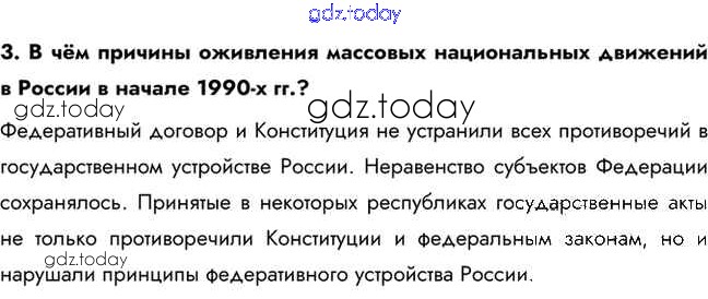 На страницах сайта gdz.today вы найдете учебный и вспомогательный материал, направленный на улучшения знаний школьной программы. ГДЗ - онлайн мир знаний Вопросы и задания для работы с текстом параграфа Межнациональные отношения и национальная политика в 1990-е гг. 3 Учебнику по Истории для 10 класса Горинов, Данилов Просвещение 2016