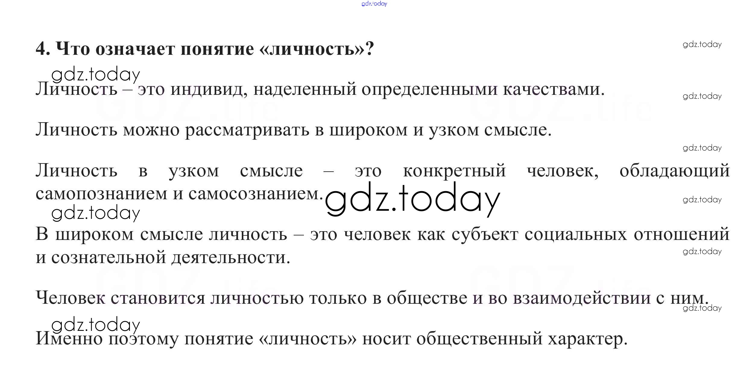 На страницах сайта gdz.today вы найдете учебный и вспомогательный материал, направленный на улучшения знаний школьной программы. ГДЗ - онлайн мир знаний Вопросы для повторения к главе 1 страница 100 Решение к главе 1. Человек в обществе 4 Учебнику по Обществознанию для 10 класса Боголюбов, Аверьянов Базовый уровень Просвещение 2015