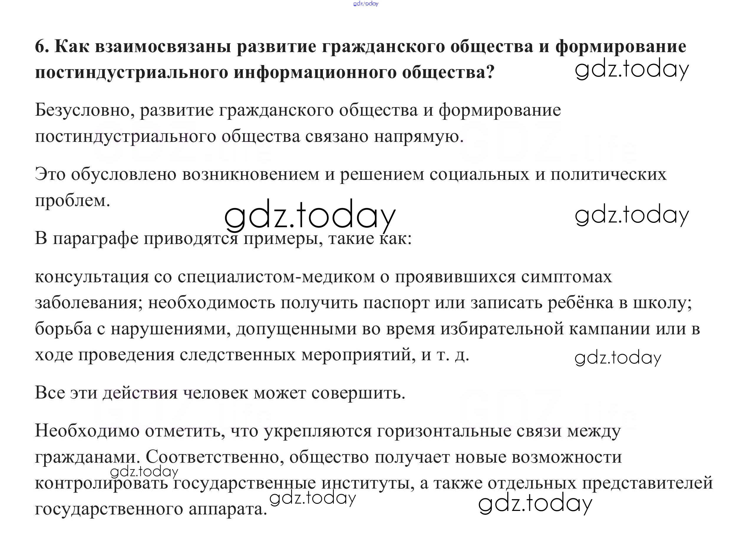 На страницах сайта gdz.today вы найдете учебный и вспомогательный материал, направленный на улучшения знаний школьной программы. ГДЗ - онлайн мир знаний Вопросы для самопроверки §8. Современное общество 6 Учебнику по Обществознанию для 10 класса Боголюбов, Аверьянов Базовый уровень Просвещение 2015