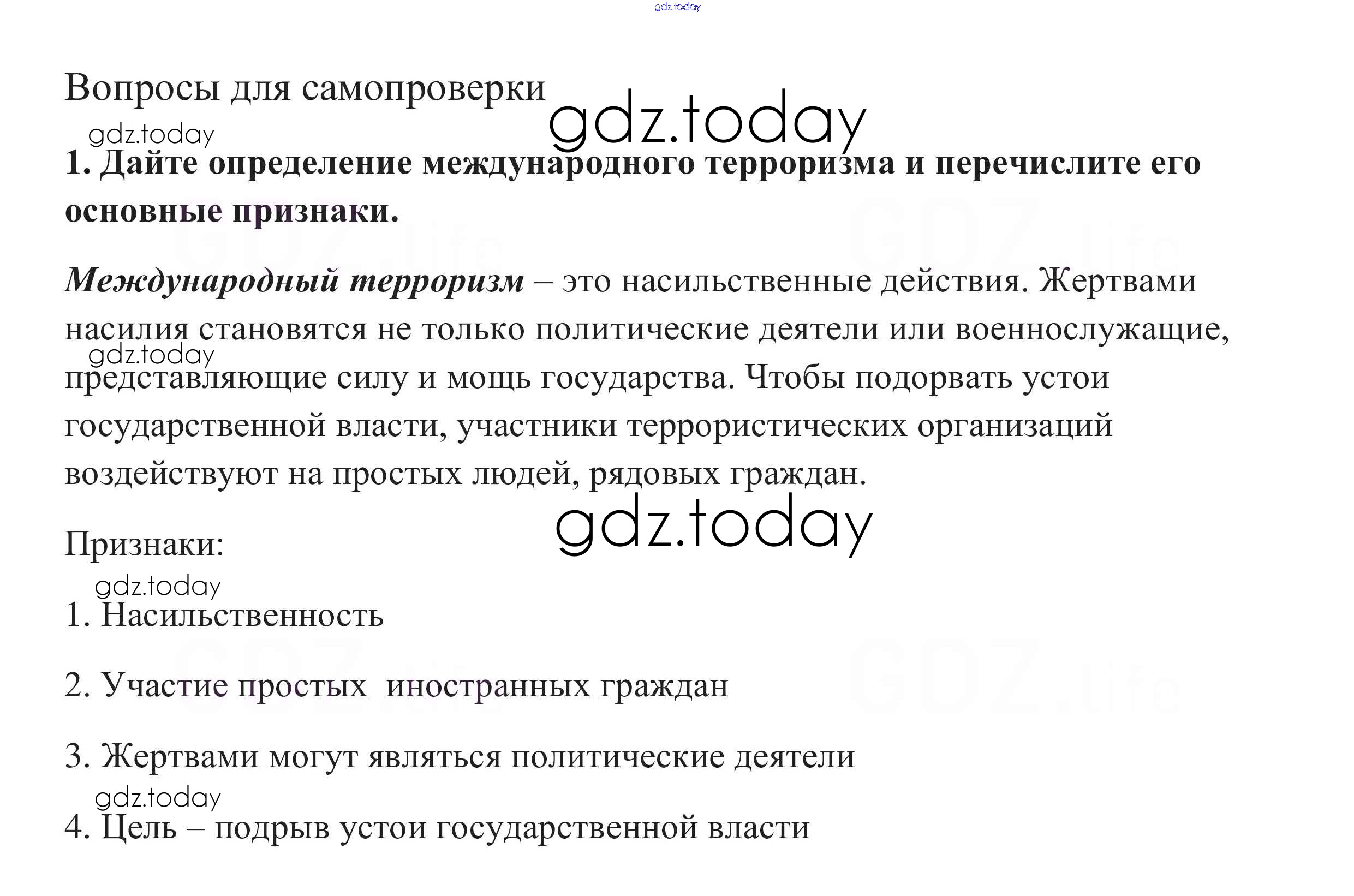 На страницах сайта gdz.today вы найдете учебный и вспомогательный материал, направленный на улучшения знаний школьной программы. ГДЗ - онлайн мир знаний Вопросы для самопроверки §9. Глобальная угроза международного терроризма 1 Учебнику по Обществознанию для 10 класса Боголюбов, Аверьянов Базовый уровень Просвещение 2015