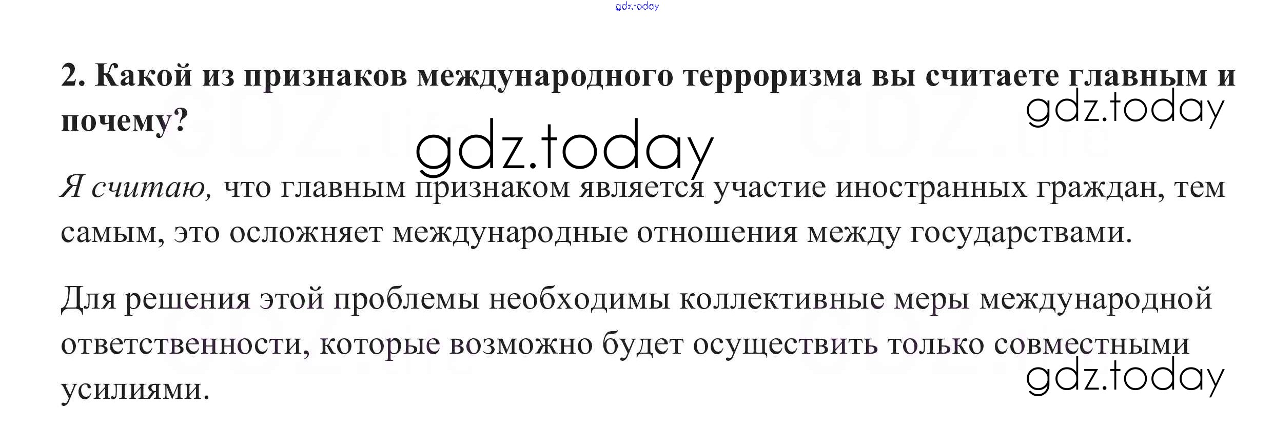На страницах сайта gdz.today вы найдете учебный и вспомогательный материал, направленный на улучшения знаний школьной программы. ГДЗ - онлайн мир знаний Вопросы для самопроверки §9. Глобальная угроза международного терроризма 2 Учебнику по Обществознанию для 10 класса Боголюбов, Аверьянов Базовый уровень Просвещение 2015