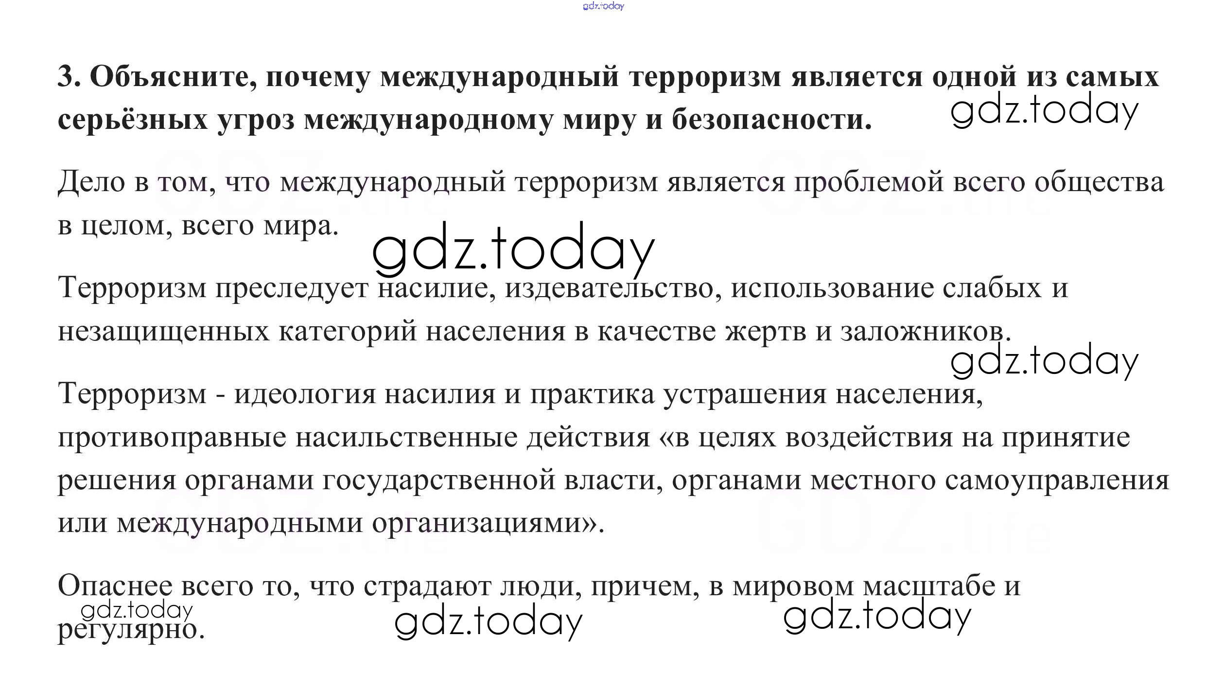На страницах сайта gdz.today вы найдете учебный и вспомогательный материал, направленный на улучшения знаний школьной программы. ГДЗ - онлайн мир знаний Вопросы и задания к документу §9. Глобальная угроза международного терроризма 3 Учебнику по Обществознанию для 10 класса Боголюбов, Аверьянов Базовый уровень Просвещение 2015