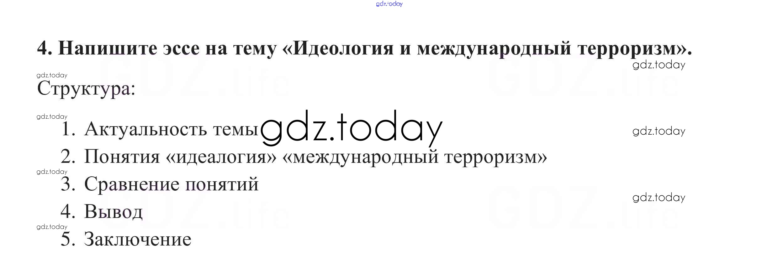 На страницах сайта gdz.today вы найдете учебный и вспомогательный материал, направленный на улучшения знаний школьной программы. ГДЗ - онлайн мир знаний Задания §9. Глобальная угроза международного терроризма 4 Учебнику по Обществознанию для 10 класса Боголюбов, Аверьянов Базовый уровень Просвещение 2015