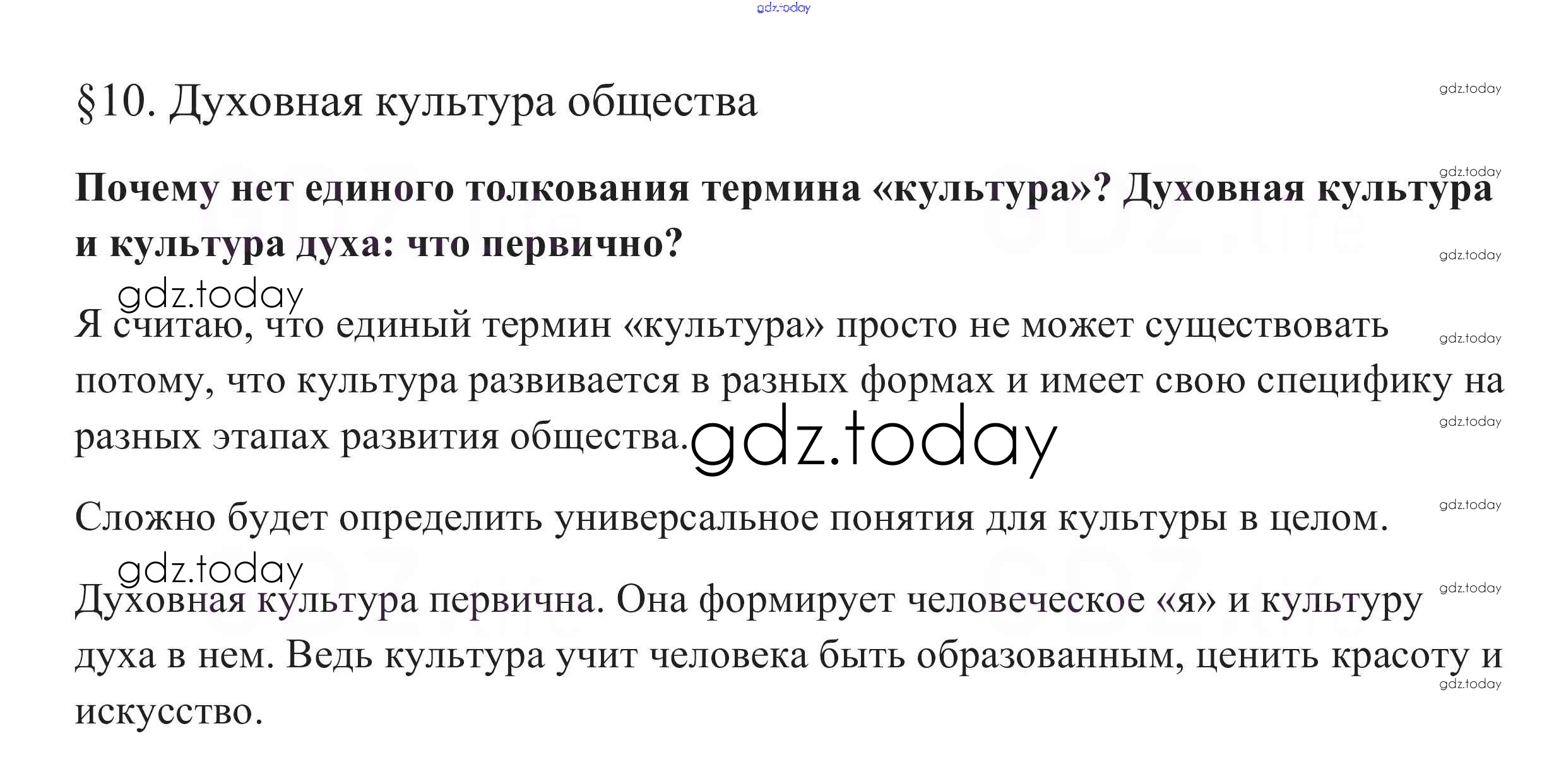 На страницах сайта gdz.today вы найдете учебный и вспомогательный материал, направленный на улучшения знаний школьной программы. ГДЗ - онлайн мир знаний В начале параграфа §10. Духовная культура общества 1 Учебнику по Обществознанию для 10 класса Боголюбов, Аверьянов Базовый уровень Просвещение 2015