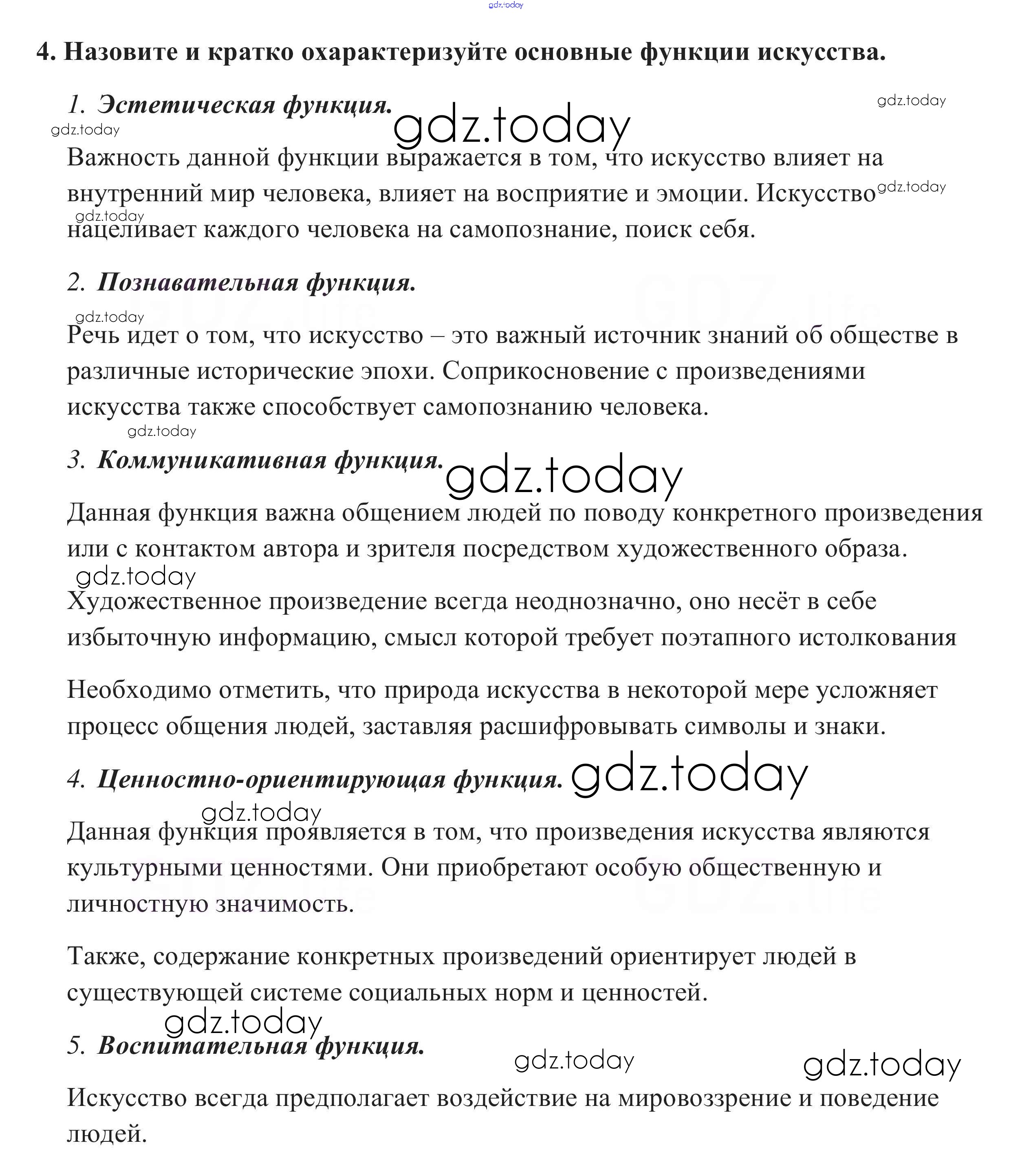 На страницах сайта gdz.today вы найдете учебный и вспомогательный материал, направленный на улучшения знаний школьной программы. ГДЗ - онлайн мир знаний Вопросы для самопроверки §15. Искусство 4 Учебнику по Обществознанию для 10 класса Боголюбов, Аверьянов Базовый уровень Просвещение 2015