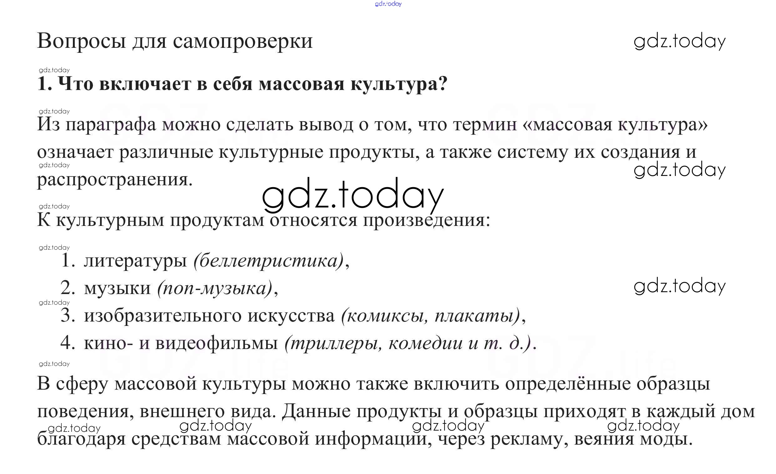На страницах сайта gdz.today вы найдете учебный и вспомогательный материал, направленный на улучшения знаний школьной программы. ГДЗ - онлайн мир знаний Вопросы для самопроверки §16. Массовая культура 1 Учебнику по Обществознанию для 10 класса Боголюбов, Аверьянов Базовый уровень Просвещение 2015