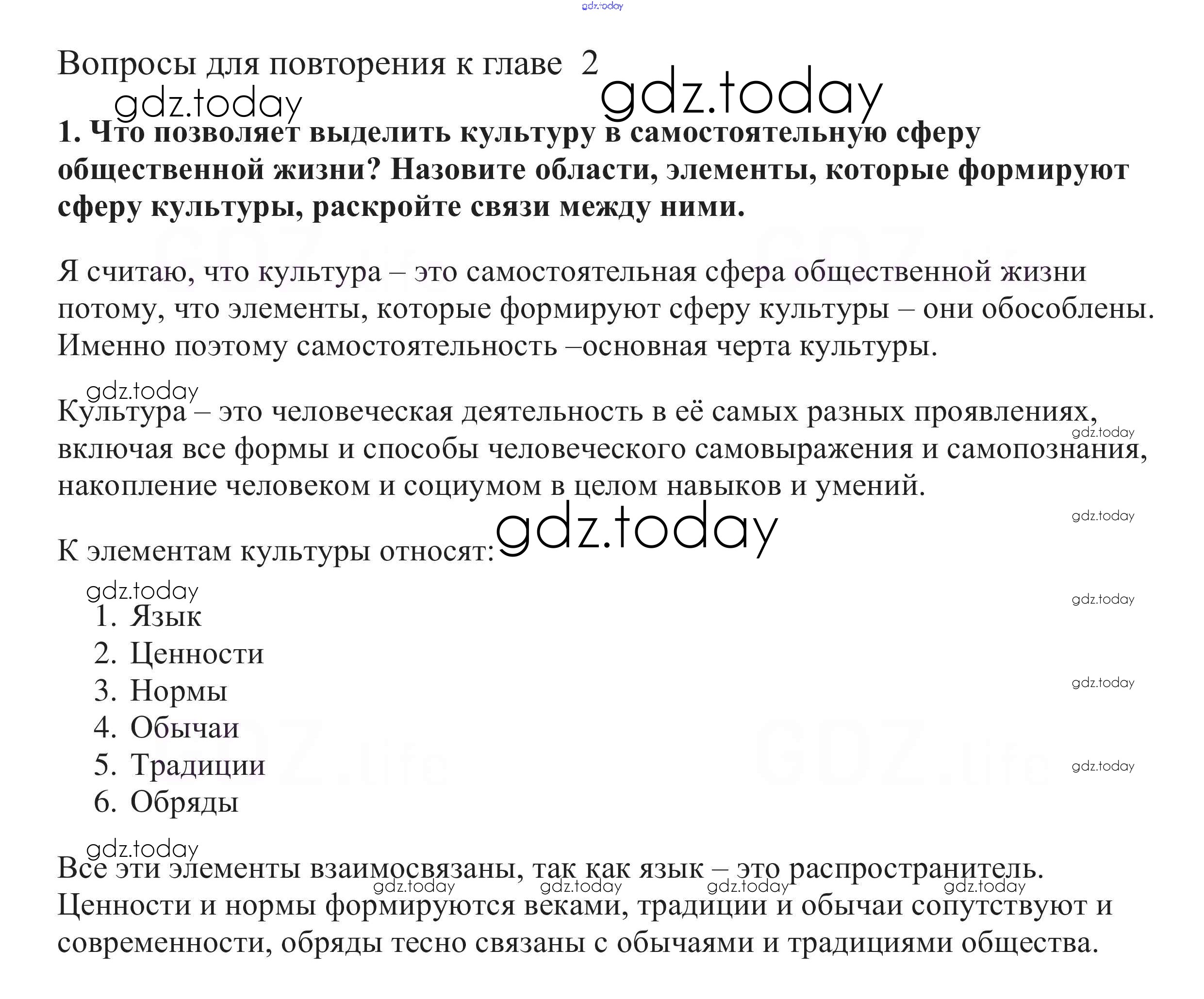 На страницах сайта gdz.today вы найдете учебный и вспомогательный материал, направленный на улучшения знаний школьной программы. ГДЗ - онлайн мир знаний Вопросы для повторения к главе 2 страница 173 Решение к главе 2. Общество как мир культуры 1 Учебнику по Обществознанию для 10 класса Боголюбов, Аверьянов Базовый уровень Просвещение 2015