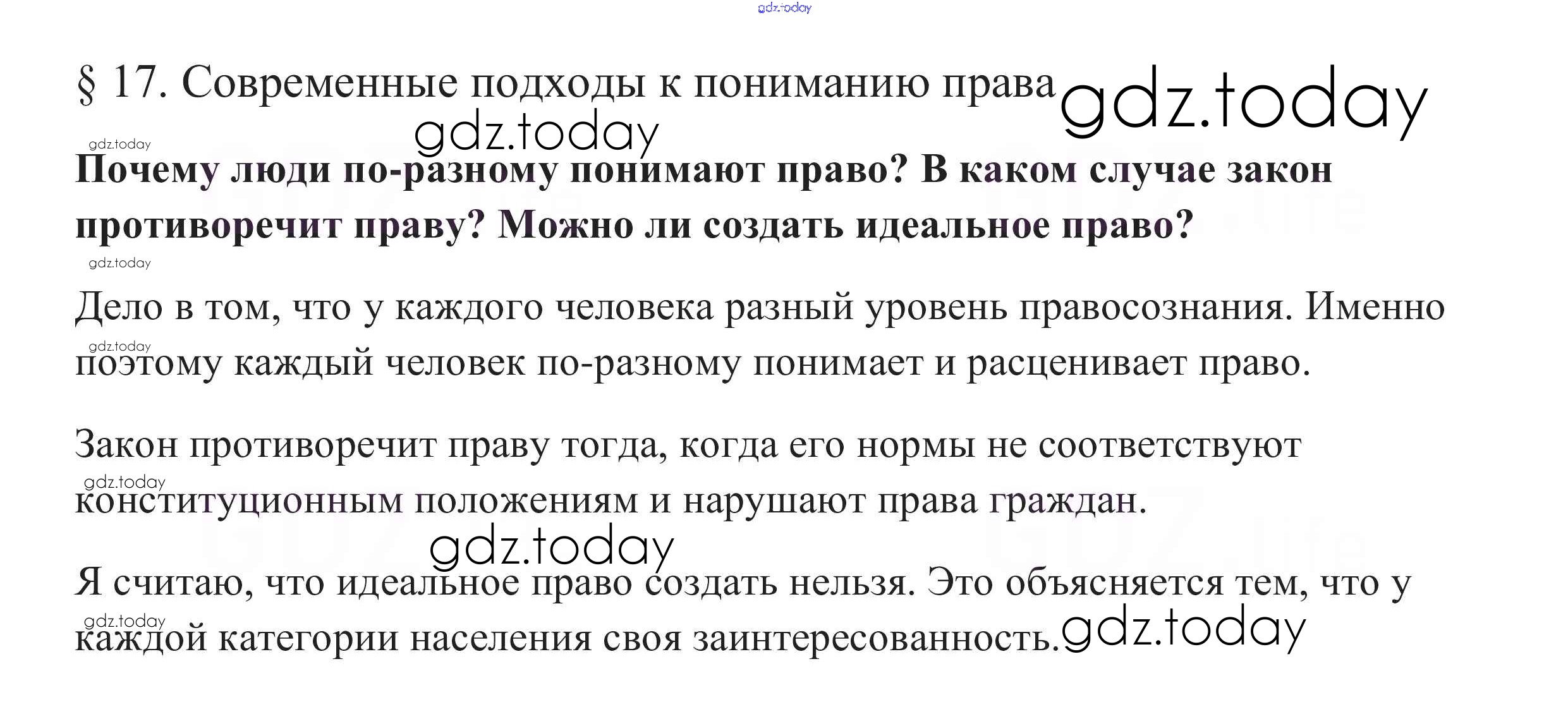 На страницах сайта gdz.today вы найдете учебный и вспомогательный материал, направленный на улучшения знаний школьной программы. ГДЗ - онлайн мир знаний В начале параграфа §17. Современные подходы к пониманию права 1 Учебнику по Обществознанию для 10 класса Боголюбов, Аверьянов Базовый уровень Просвещение 2015